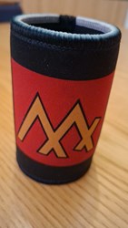 Bierblik houder met het huismerk-gedeelte van het Nijdamstra clanwapen: de goudkleurige ' M ' op een donkerrode achtergrond. Beerholder.